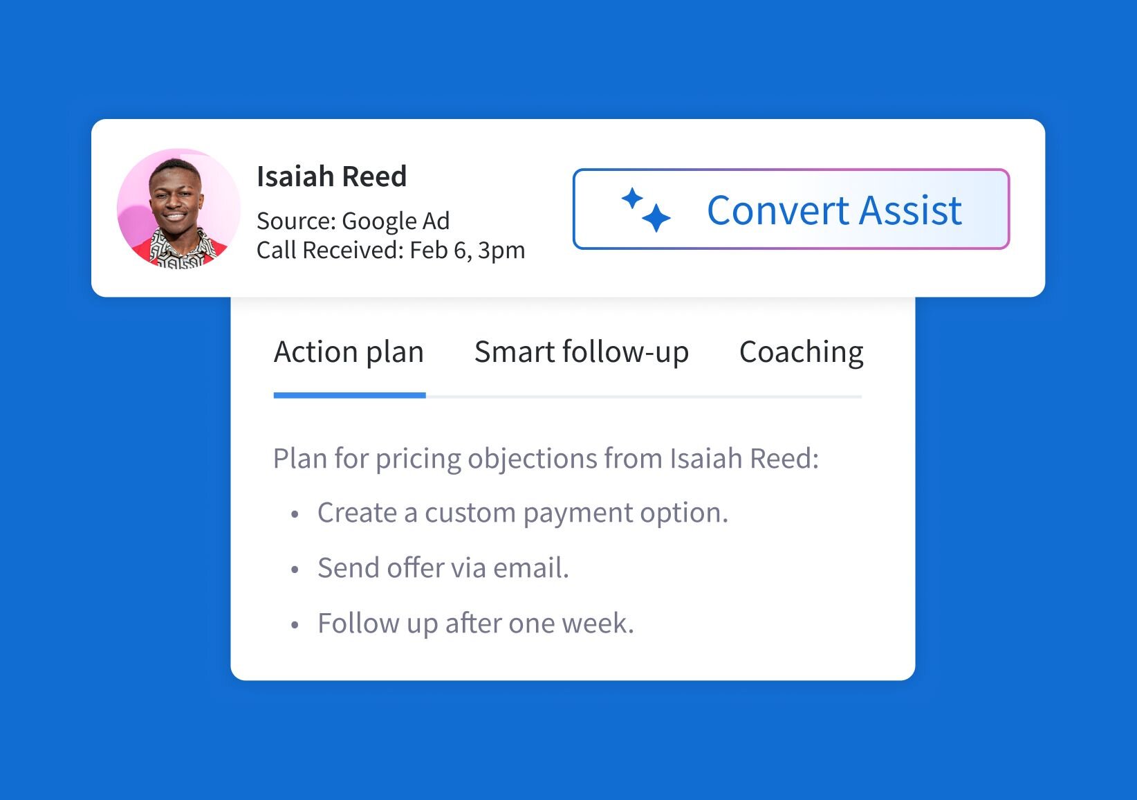 Convert Assist brings together three successful alpha features – action plans, call coaching and smart follow up – from the company’s innovation program, CallRail Labs. These features combined bring CallRail customers a fast and effective way to personalize conversations with leads and accelerate response times to increase conversion rates.